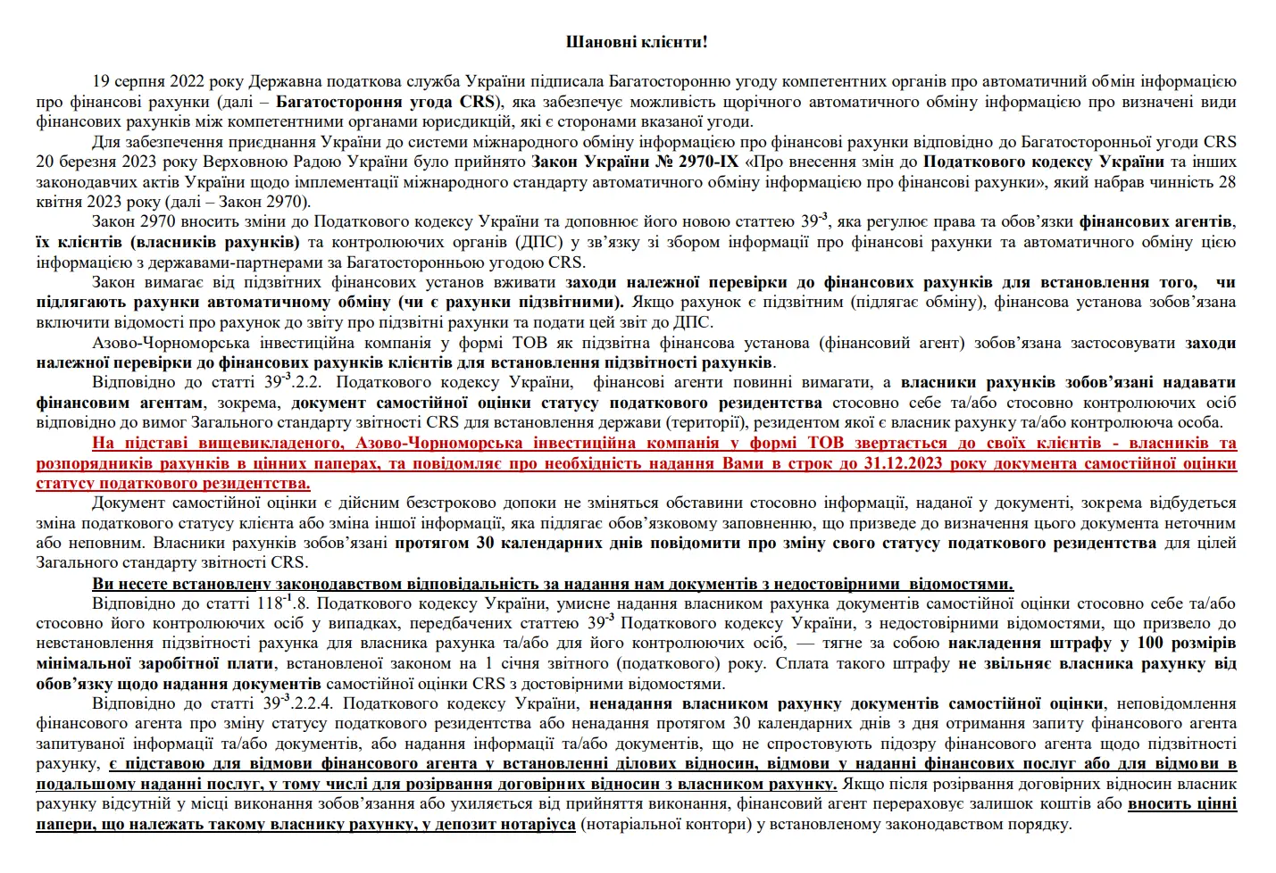 У зв‘язку з цим, депонентам Депозитарної установи Азово-Чорноморська інвестиційна компанія у формі ТОВ, які уклали Договір про обслуговування рахунку у цінних паперах до 01.01.2021 р. та мають відкриті рахунки в цінних паперах, необхідно звернутись до Депозитарної установи для підписання вищезазначеної угоди. Додаткова угода до Договору про обслуговування рахунку у цінних паперах ні в якому разі не погіршує умови обслуговування існуючих депонентів, а лише відображає вимоги чинного законодавства України. Для підписання Додаткової угоди при собі необхідно мати оригінали паспорта, довідки про реєстрацію місця проживання та картки платника податків.