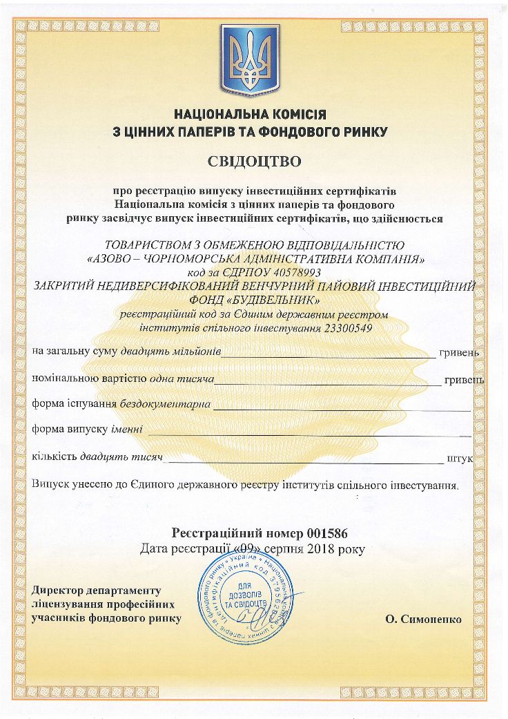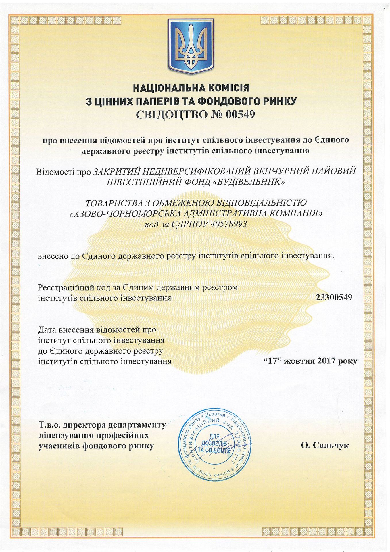 Свідоцтво про внесення відомостей про ІСІ до ЄДР ІСІ "ЗНВПІФ "Будівельник"