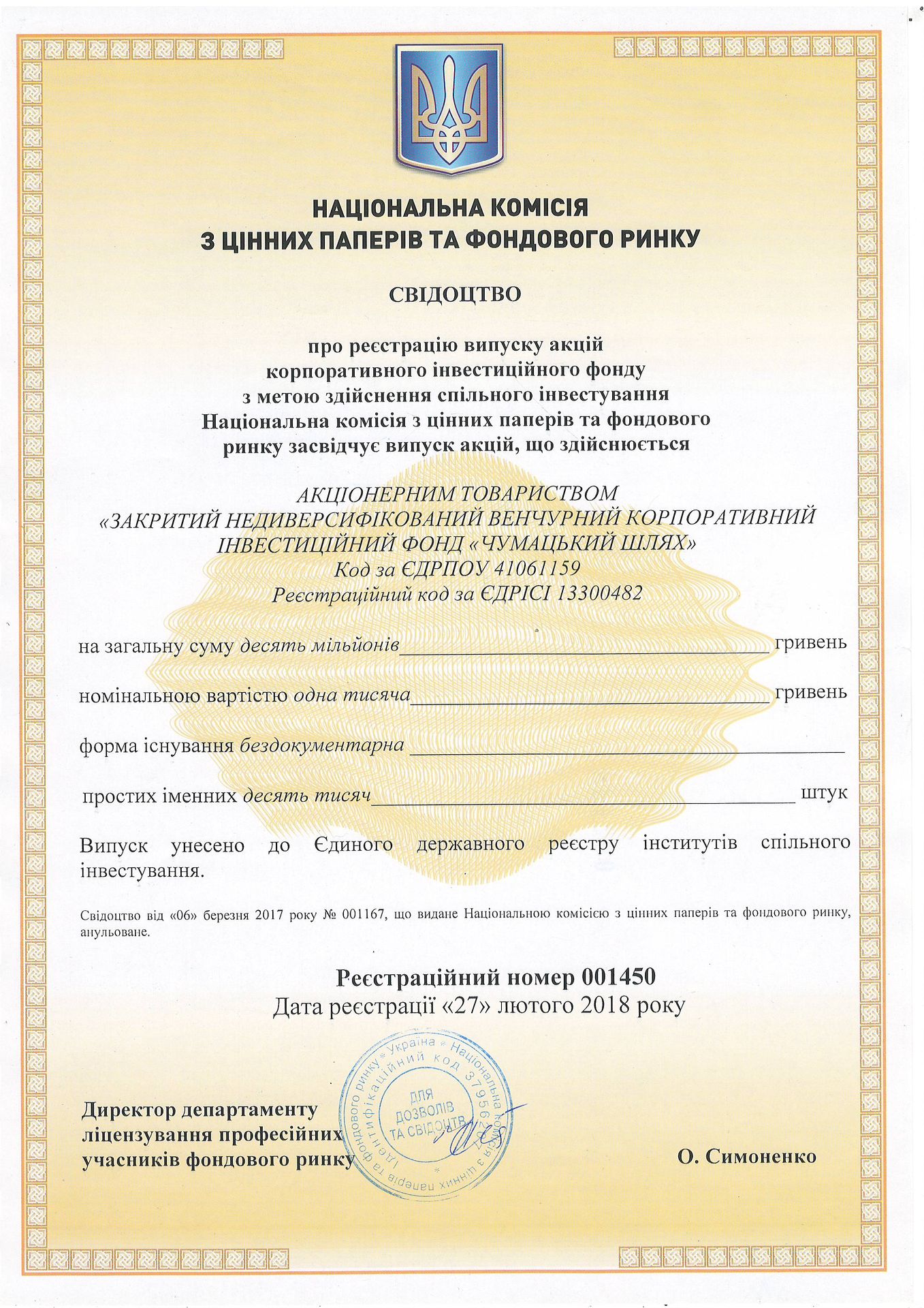 Свідоцтво про реєстрацію випуску акцій АТ "ЗНВКІФ "Чумацький шлях" № 001450 від 27.02.2018р.