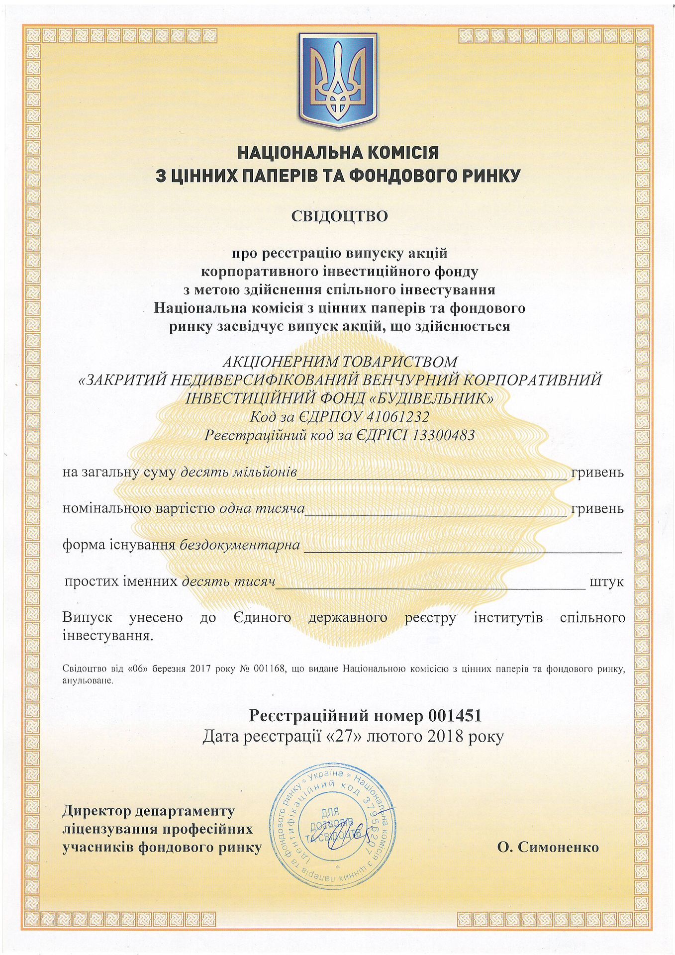 Свідоцтво про реєстрацію випуску акцій АТ "ЗНВКІФ "Будівельник" № 001451 від 27.02.2018р.
